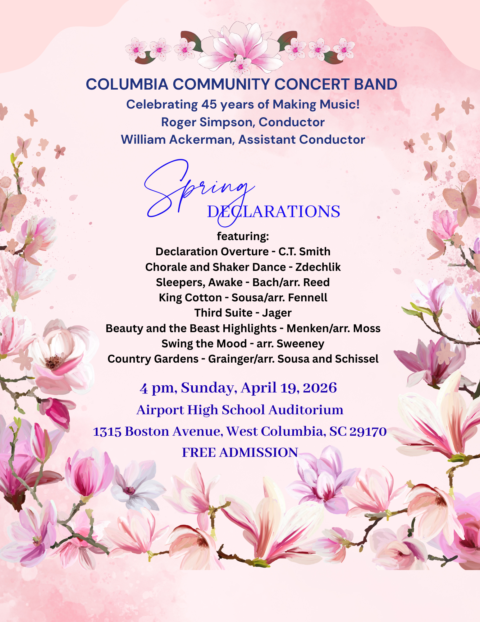 The Columbia Community Concert Band is an all-volunteer, adult, nonprofit organization that has grown from 14 members at its inception in 1981 to its present size of over 80 musicians. The band presents an average of five concerts each season, which runs from September until June. We play a wide assortment of music; you can view our performance history and our repertoire history beginning with the 2005-2006 season. Band members come from all walks of life, representing a full gamut of occupations. Though very few are professional musicians, the majority were members of their all-state bands in high school, and many performed in college or military bands. Our membership directory lists our members, their hometowns, and their occupations. The band has performed for the South Carolina Music Educators Association three times and has also performed for national conventions of the American School Band Directors Association and the Association of Concert Bands. In additiuon, the band performed many times at the Piccolo Spoleto Festival. The Columbia Community Concert Band is a member of the Association of Concert Bands, Inc. The band is grateful to the administration of Lexington County School District Two and to the administration, faculty, staff, and students of Airport High School, particularly Robert Spitler, band director, Amanda Wrona, choral director, Caitlyn McDonald, orchestra director, and Caitlin White, theater teacher, for their assistance and use of their facilities and equipment. Special thanks to Adam Raczkowski for his assistance with sound and lighting and to all who volunteer their time, talents, and resources to make the band possible. The band would be very appreciative if you would like to make a donation to help with our expenses. We are a 501(c)(3) non-profit organization, so your donation is tax-deductible. Please see our contact page for our mailing address. |